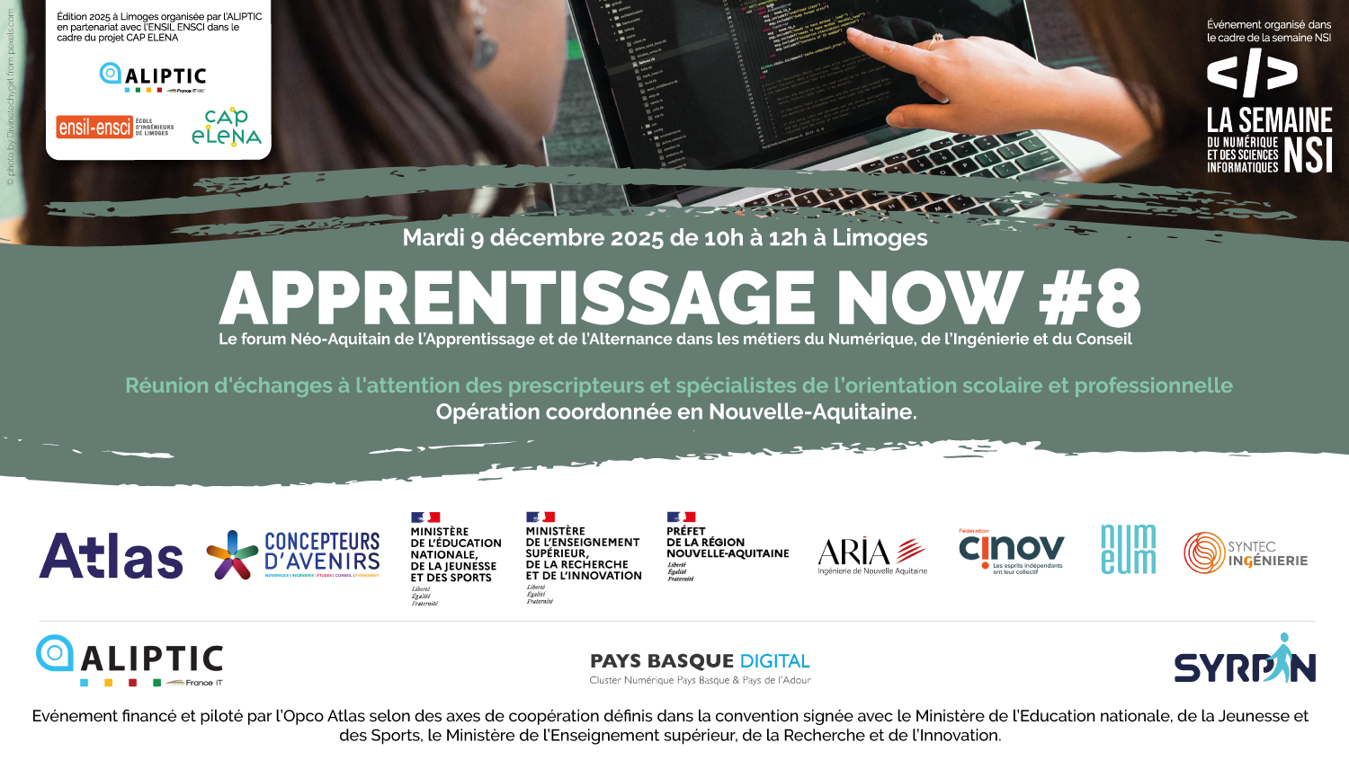 Evénement financé et piloté par l’Opco Atlas selon des axes de coopération définis dans la convention signée avec le Ministère de l’Education nationale, de la Jeunesse et des Sports, le Ministère de l’Enseignement supérieur, de la Recherche et de l’Innovation. Les opérations Apprentissage Now #8 sont organisées par les clusters numériques de Nouvelle-Aquitaine.