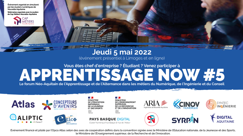 Pour la 5ème année consécutive #ApprentissageNow, le forum Néo-Aquitain de l’Apprentissage et de l’Alternance dans les métiers du Numérique, de l’Ingénierie et du Conseil, est coorganisé de façon simultanée avec l’ensemble des clusters numériques de Nouvelle-Aquitaine !
