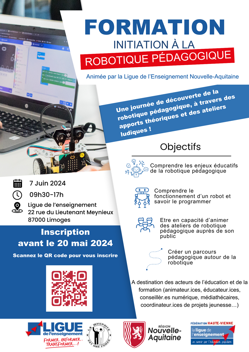 La Ligue de l’enseignement Nouvelle-Aquitaine propose une formation dédiée à la robotique pédagogique, gratuite, à destination des acteurs éducatifs (animateur.ice, enseignant.e, conseillèr.e numérique, médiathécaire…) intéressés par l'intégration de la robotique dans leurs pratiques pédagogiques. Il n’y a aucun prérequis !