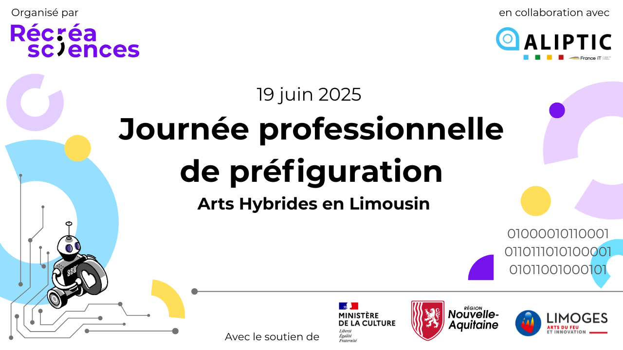 Journée organisée par Récréasciences en collaboration avec l’ALIPTIC et avec le soutien de la DRAC Nouvelle Aquitaine et de la Région Nouvelle-Aquitaine.