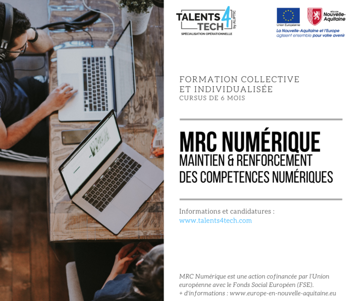 Découvrez les conditions de candidatures et les objectifs pédagogiques de ce cursus sur la page dédiée : https://www.talents4tech.com/details-du-cursus/maintien-et-renforcement-de-competences-numeriques-mrc.html