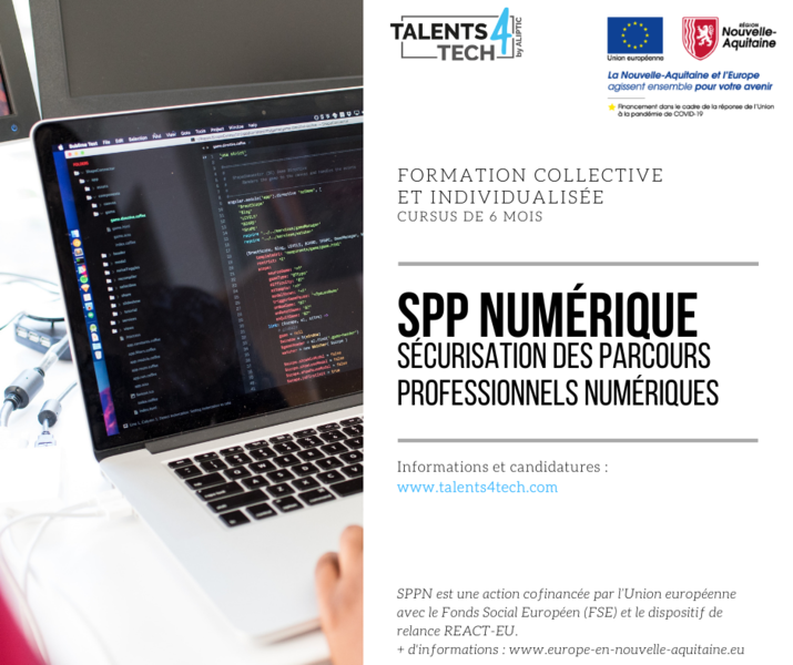 Découvrez les conditions de candidatures et les objectifs pédagogiques de ce cursus sur la page dédiée : https://www.talents4tech.com/details-du-cursus/securisation-des-parcours-professionnels-numeriques-sppn.html et sur la fiche ALIPTIC2022_SPPNumerique_web
