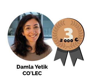 C’est le projet CO’LEC qui arrive en troisième place du Challenge. Damla Yetik, CEO de la startup CO'LEC propose une solution de collecte des appareils électriques inutilisés (fonctionnels ou non) du grand public en échange de récompenses (bons de réduction chez les commerçants locaux).