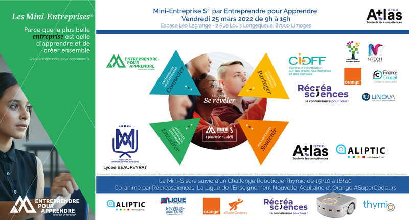 Coordonnée par l’ALIPTIC et financée par l’OPCO ATLAS, La Mini-Entreprise S par Entreprendre pour Apprendre proposée par Fabien Loicq et Ebru Celik a réuni dans la bonne humeur le 25 mars dernier 80 lycéens de l’institution Beaupeyrat pour relever un défi autour de 2 problématiques liées au Numérique :
