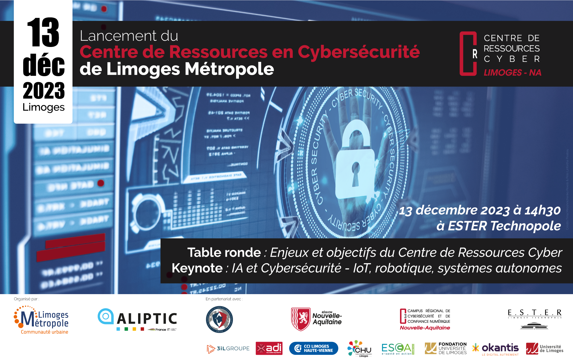 ANSSI - Agence nationale de la sécurité des systèmes d'information | Région Nouvelle-Aquitaine | Campus Régional de Cybersécurité et de Confiance Numérique Nouvelle-Aquitaine | ESTER Technopole | 3iL Ingénieurs | ADI Nouvelle-Aquitaine | CCI DE LIMOGES ET DE LA HAUTE-VIENNE | CHU de Limoges | GRADeS ESEA Nouvelle-Aquitaine | Fondation Partenariale de l'Université de Limoges | Okantis | Université de Limoges