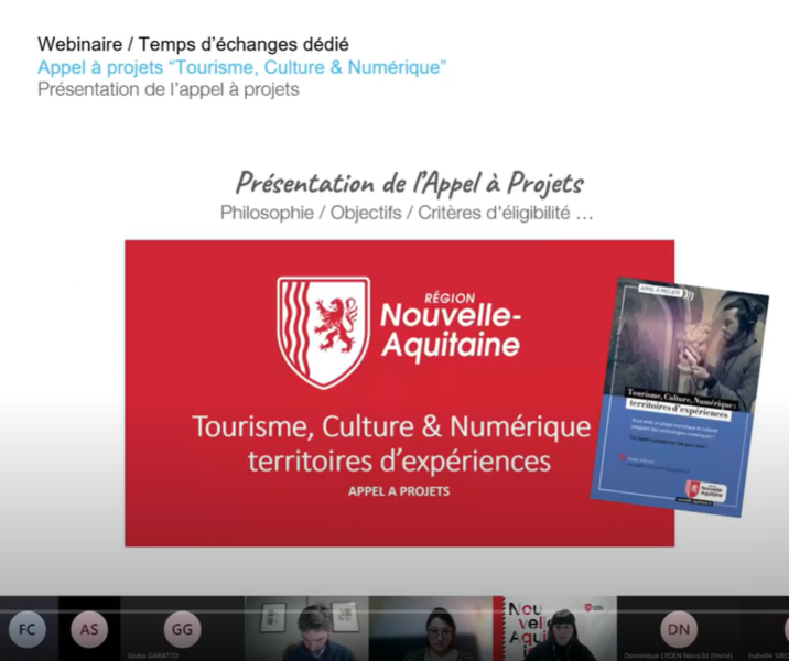 Webinaire organisé le 14 janvier 2021 par l'ALIPTIC à l'attention des opérateurs culturels et/ou touristiques et des entreprises du numérique de Nouvelle-Aquitaine souhaitant porter un projet et soumettre leur candidature à l'AAP Tourisme, Culture et Numérique.