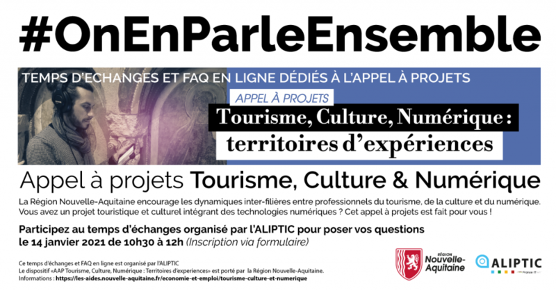 L'ALIPTIC organise un temps d'échanges dédié à l'Appel à Projet Tourisme Culture et Numérique de la Région Nouvelle Aquitaine le jeudi 14 janvier de 10h30 à midi en ligne.