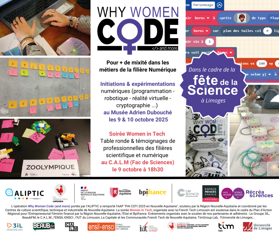 L’opération Why Women Code (and more) portée par l’ALIPTIC a remporté l'AAP "PAI CSTI 2025 en Nouvelle-Aquitaine", soutenu par la Région Nouvelle-Aquitaine et coordonné par les Centres de culture scientifique, technique et industrielle de Nouvelle-Aquitaine. La soirée Women In Tech, organisée avec la French Tech Limousin est soutenue dans le cadre du Plan d’Action Régional pour l’Entrepreneuriat Féminin financé par la Région Nouvelle-Aquitaine, l’Etat et Bpifrance. Evènements organisés avec le soutien de nos partenaires et adhérents : Le Groupe 3IL, BeaubFM, le C.A.L.M., l’ENSIL-ENSCI , l’IUT du Limousin, La Capitale et les Communautés French Tech de Nouvelle-Aquitaine, TimGroup Lab, l’Université de Limoges...