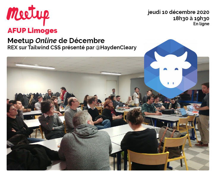 Nos partenaires de l'AFUP Limoges (Association Française des Utilisateurs de PHP) organisent leur prochain Meetup en ligne sur un sujet "non PHP" car il s'agira d'un retour d'expérience autour du Framework CSS TailWind CSS ( https://tailwindcss.com ) présenté par @HaydenCleary.