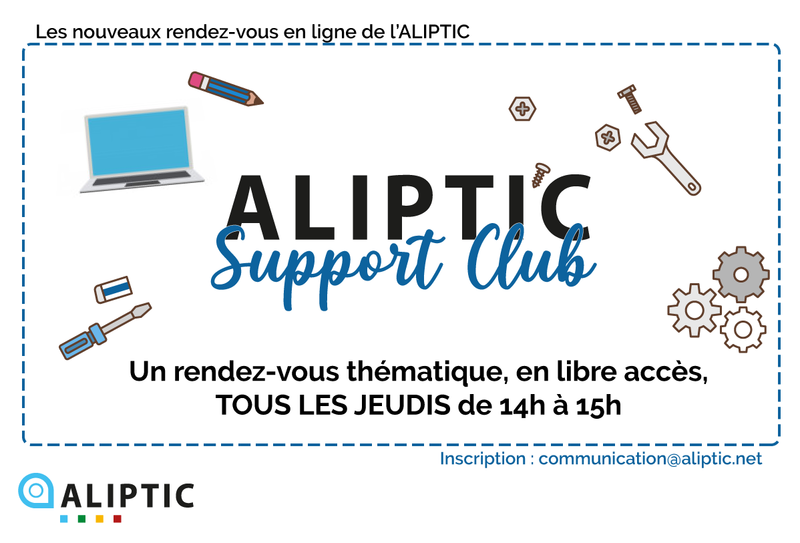ALIPTIC “Support Club” c'est votre nouveau rendez-vous hebdomadaire, tous les jeudis, pour répondre à vos problématiques de travail tout en vous sachant bien confinés chez vous !