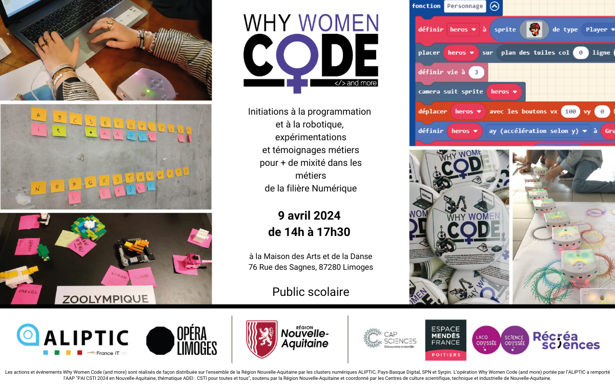 L’opération Why Women Code (and more) portée par l’ALIPTIC a remporté l'AAP "PAI CSTI 2024 en Nouvelle-Aquitaine, thématique ADEI : CSTI pour toutes et tous", soutenu par la Région Nouvelle-Aquitaine et coordonné par les Centres de culture scientifique, technique et industrielle de Nouvelle-Aquitaine.