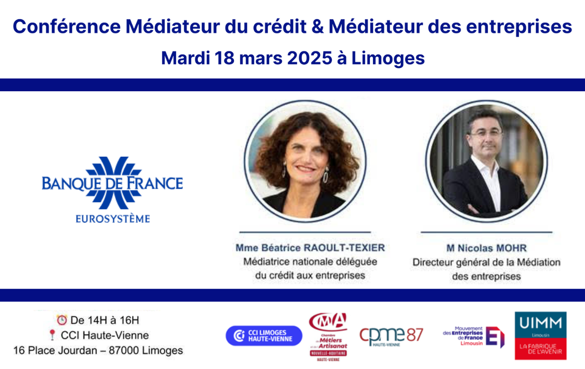 Rejoignez nous le temps d'une conférence, animée par le Médiateur des Entreprises et le Médiateur du Crédit à la CCI de Limoges, Place Jourdan, mardi 18 mars de 14h00 à 16h00.