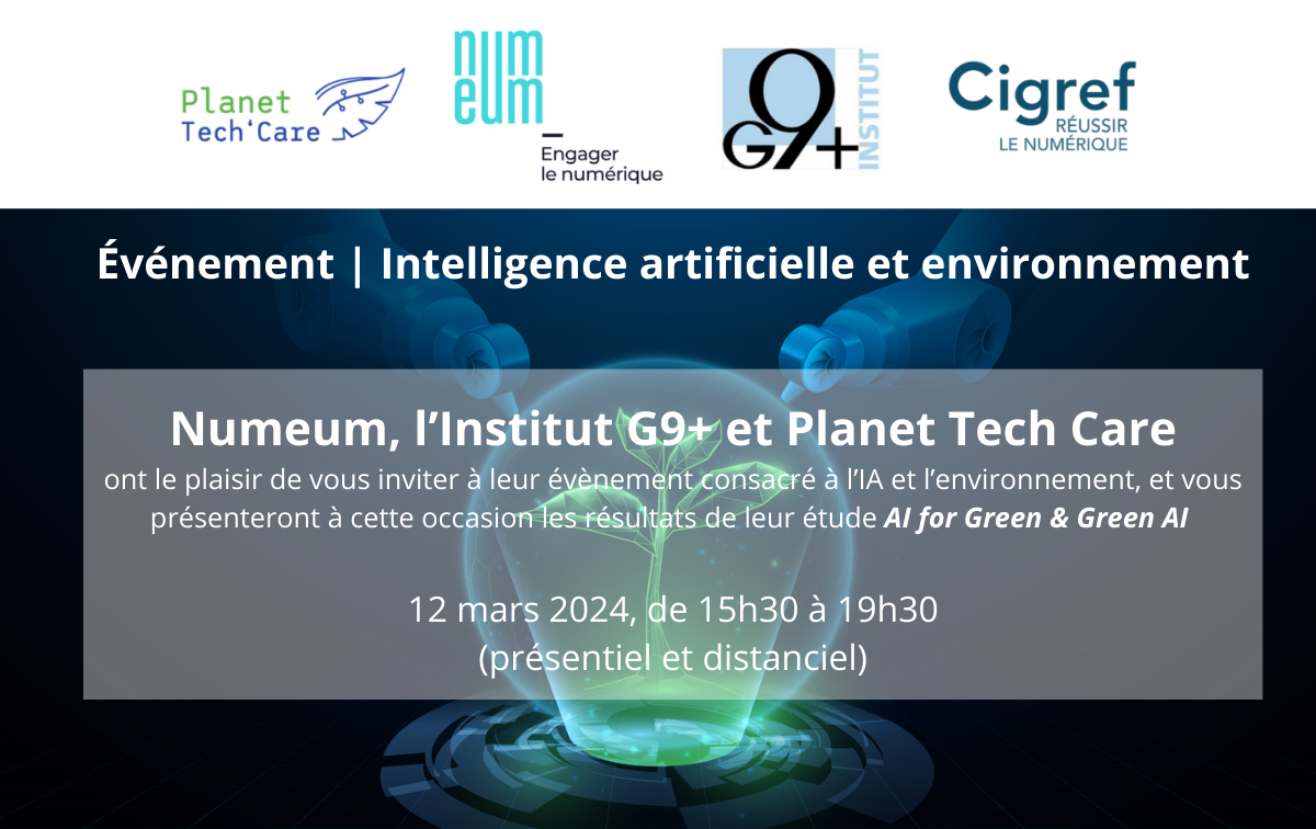 Numeum, l’Institut G9+ et Planet Tech Care, ont le plaisir de vous inviter à leur évènement consacré à l’IA et l’environnement, et vous présenteront à cette occasion les résultats de leur étude AI for Green & Green AI le 12 mars 2024, de 15h30 à 19h30.
